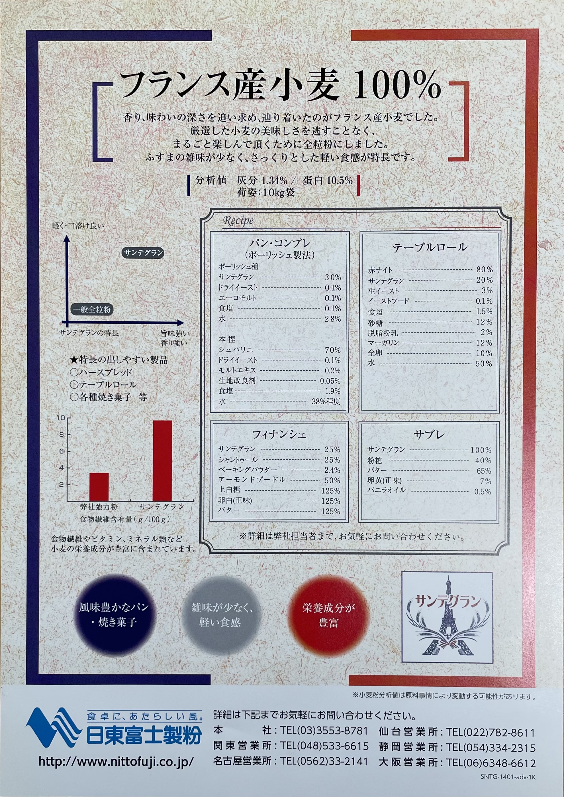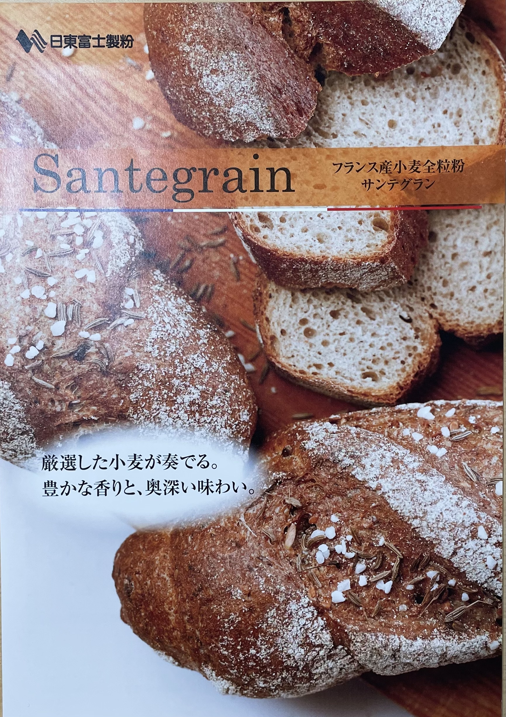 フランス産小麦100%使用。全粒粉とは小麦の表皮、胚芽、胚乳をすべて粉にしたものです。胚乳だけを用いる通常の小麦粉と比べ栄養価が高く健康志向の商品作りが出来ます。
