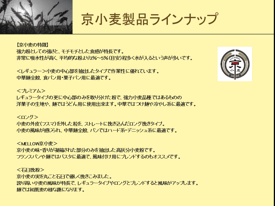 ※京小麦は吸水性が非常に高く、通常の粉の加水率より3 5 くらい多く加水していただいて丁度 通常と 同じような 生地感になります。